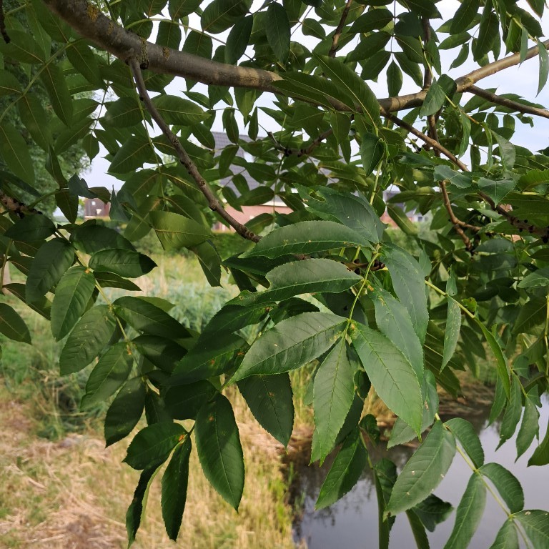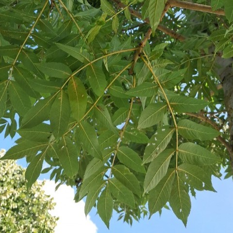 Blad: Oneven geveerd met 5 tot 9 deelblaadjes. De blaadjes zijn spits-eivormig met een gezaagde rand. Twijgen en onderzijde blad zijn zacht behaard. Schors: Grijs en glad, later met een regelmatig, ondiep, ruitvormig netwerk van groeven. Bloeiwijze: Kleine, paarsachtige bloemen in pluimen die voor het blad verschijnen. Hoogte: Kan tot 20 meter hoog worden.