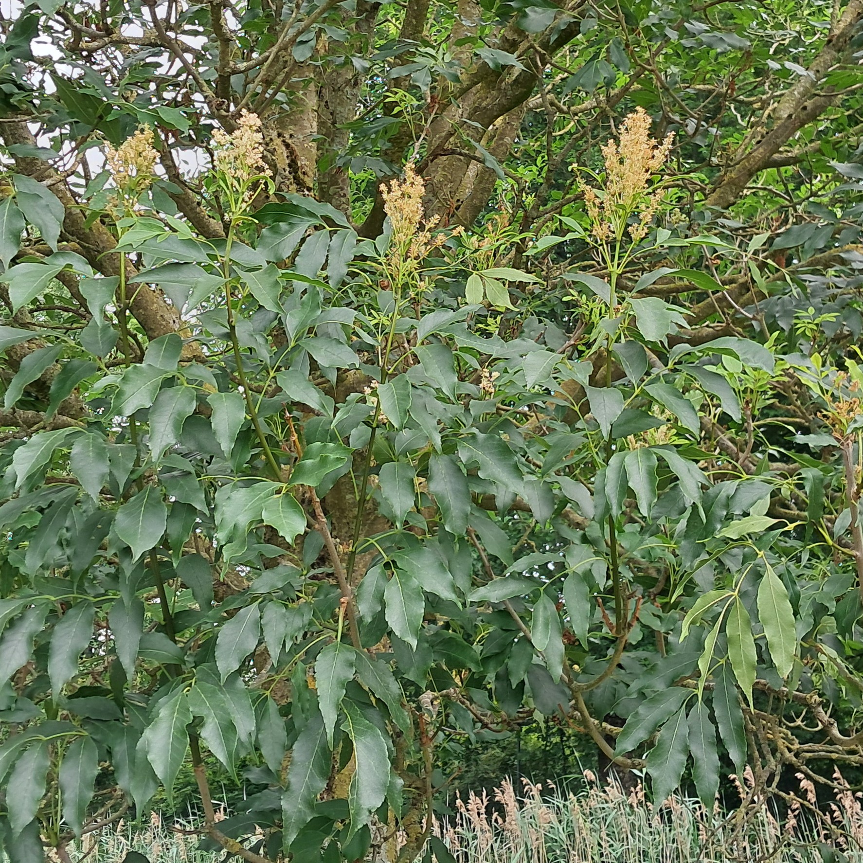 Afkomstig uit China en Korea, behoort deze boom tot de olijffamilie. In Nederland is hij aangeplant als sierboom in parken en tuinen. Hij is geen echte es, maar wordt zo genoemd vanwege de gelijkenis van het blad. De boom valt vooral op door zijn late en rijke bloei in de nazomer (augustus-september) met grote, witte, geurende pluimen, wanneer de meeste andere bomen al zijn uitgebloeid.