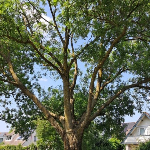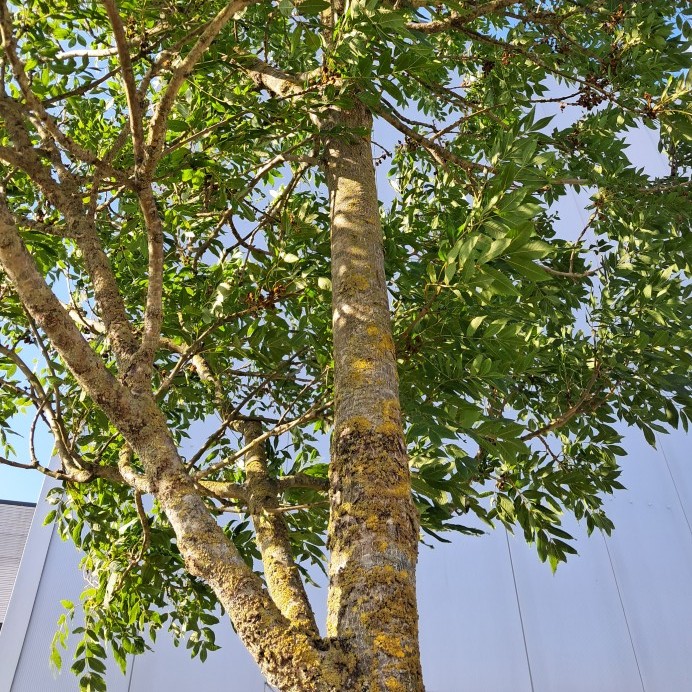 Blad: Groot en oneven geveerd, samengesteld uit 9 tot 13 lancetvormige, gezaagde deelblaadjes. De bladeren staan tegenover elkaar. Schors: Jong glad en grijsgroen, later donkergrijs en diep, ruitvormig gegroefd. Bloeiwijze: Kleine, paarsrode bloemen in pluimen die voor het blad verschijnen. De vruchten zijn gevleugelde nootjes ('helikoptertjes') die in trossen hangen. Hoogte: Kan tot 40 meter hoog worden.