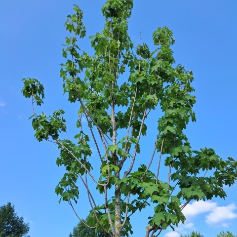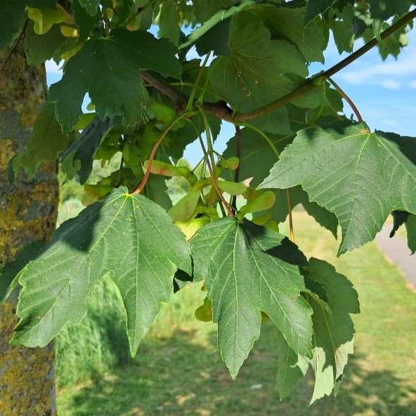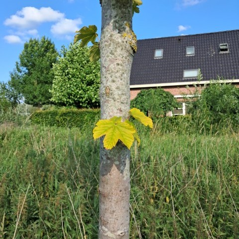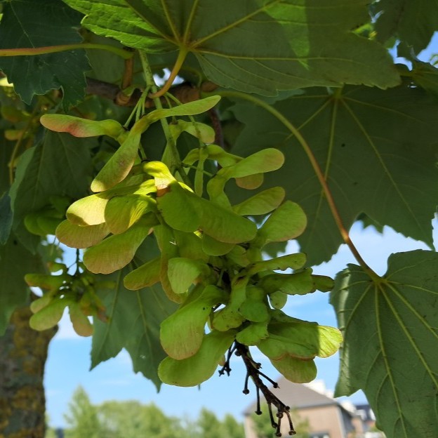Blad: Groot en handlobbig met 5 puntige, grof getande lobben. De insnijdingen tussen de lobben zijn spits (V-vormig). De bladeren staan tegenover elkaar. Schors: Eerst glad en grijs, later donkerder en afschilferend in kleine, rechthoekige plaatjes. Bloeiwijze: Geelgroene bloemen in hangende trossen, die voor of met het blad verschijnen. De vruchten zijn 'helikoptertjes' met vleugels in een scherpe hoek. Hoogte: Kan tot 35 meter hoog worden.